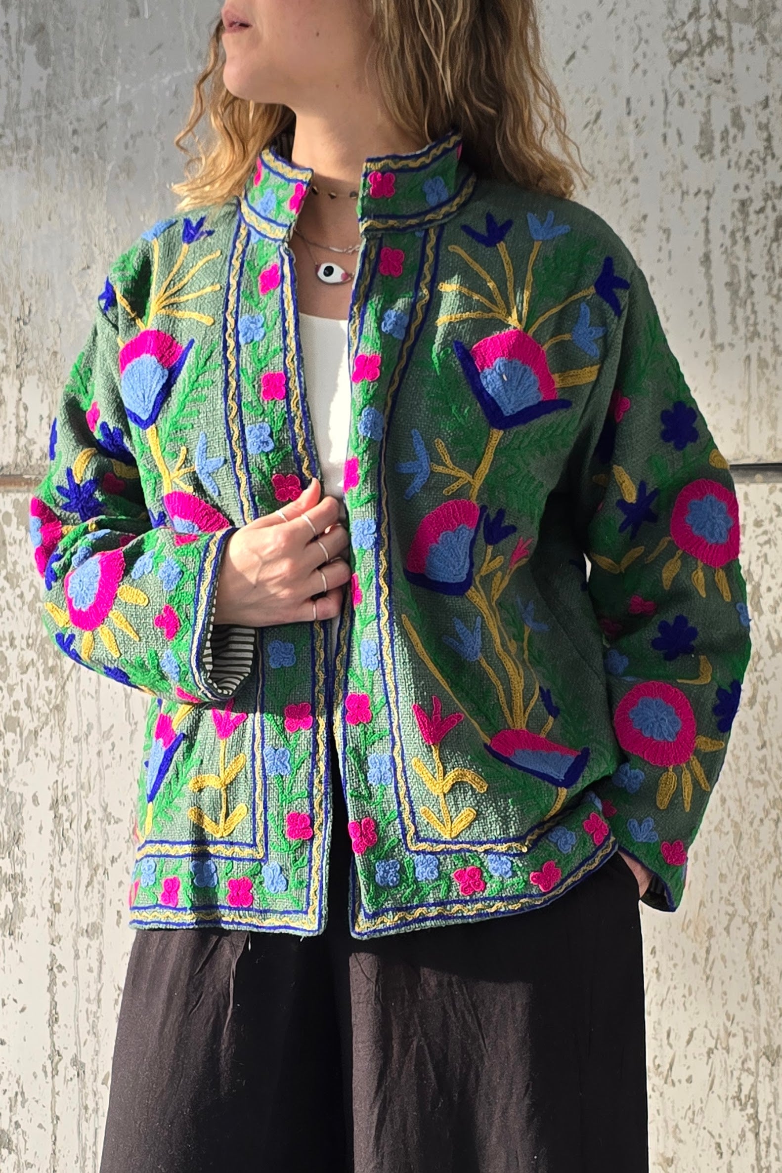 Questa giacca, è un esempio magnifico di un ricamo Suzani. Sono pezzi d'abbigliamento unici che catturano l'essenza dell'artigianato tradizionale dell'Asia Centrale, reinterpretate in chiave moderna.