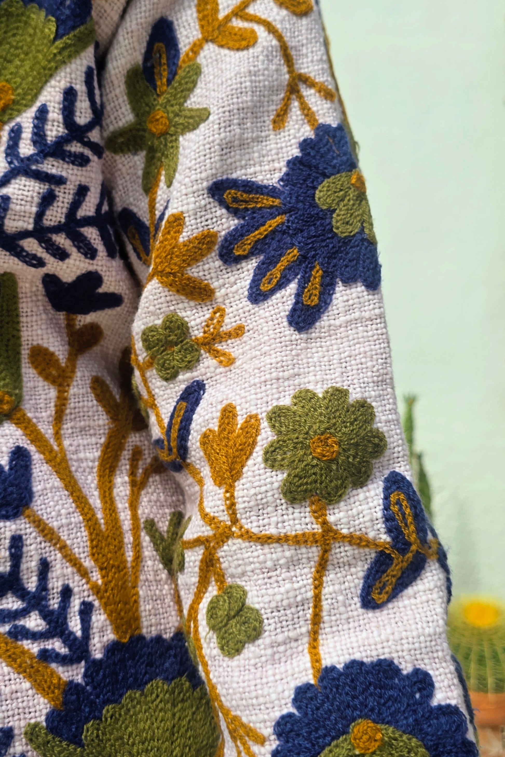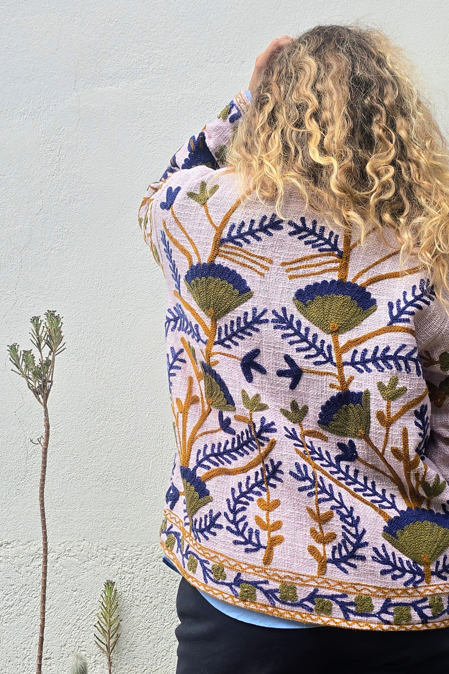 Questa giacca, è un esempio magnifico di un ricamo Suzani. Sono pezzi d'abbigliamento unici che catturano l'essenza dell'artigianato tradizionale dell'Asia Centrale, reinterpretate in chiave moderna.