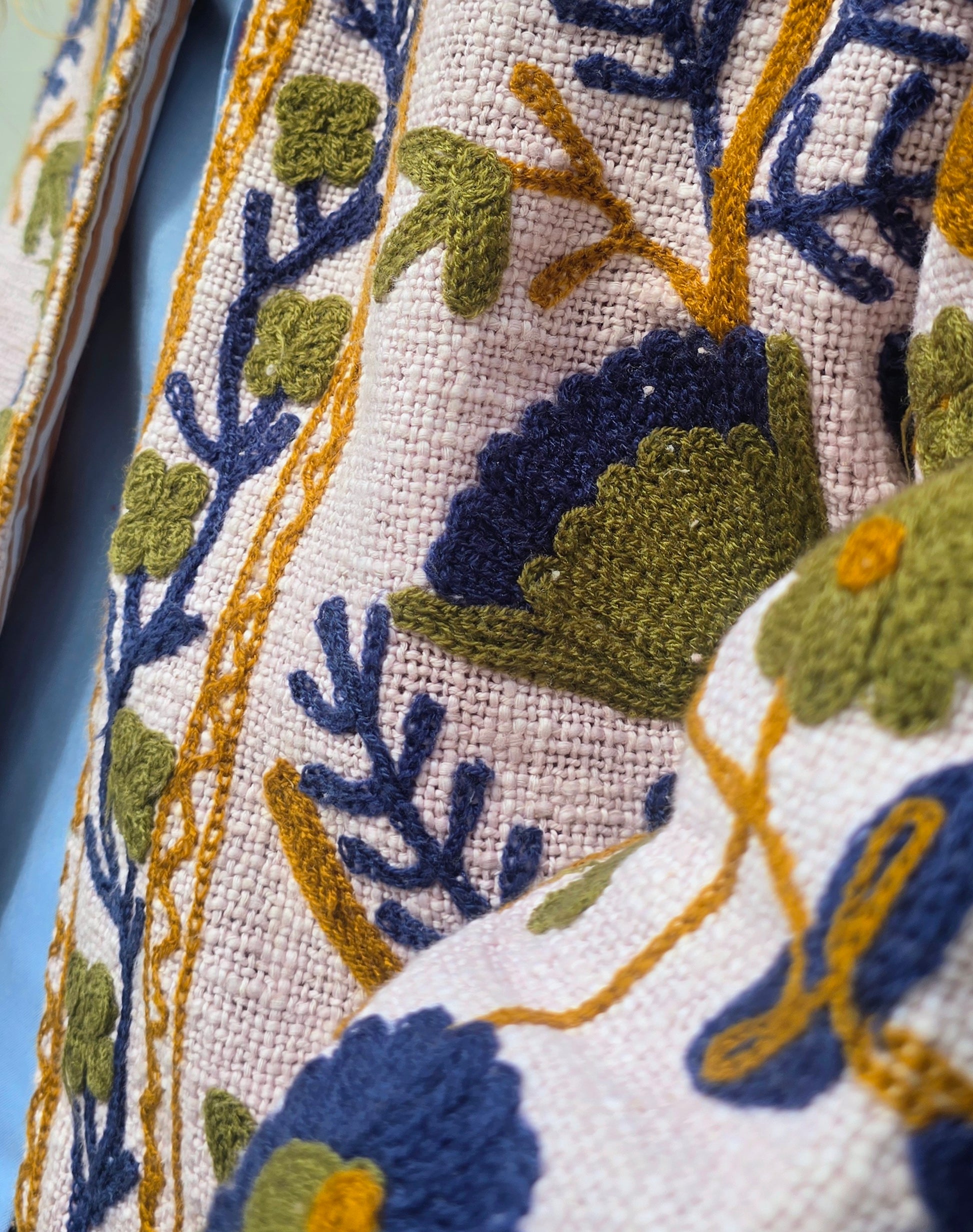 Il termine "suzani" si riferisce ai tessuti decorati a mano con motivi vivaci, ricchi di colori e simbolismi che spaziano dai fiori alle geometrie intricate, ognuno con significati culturali profondi.