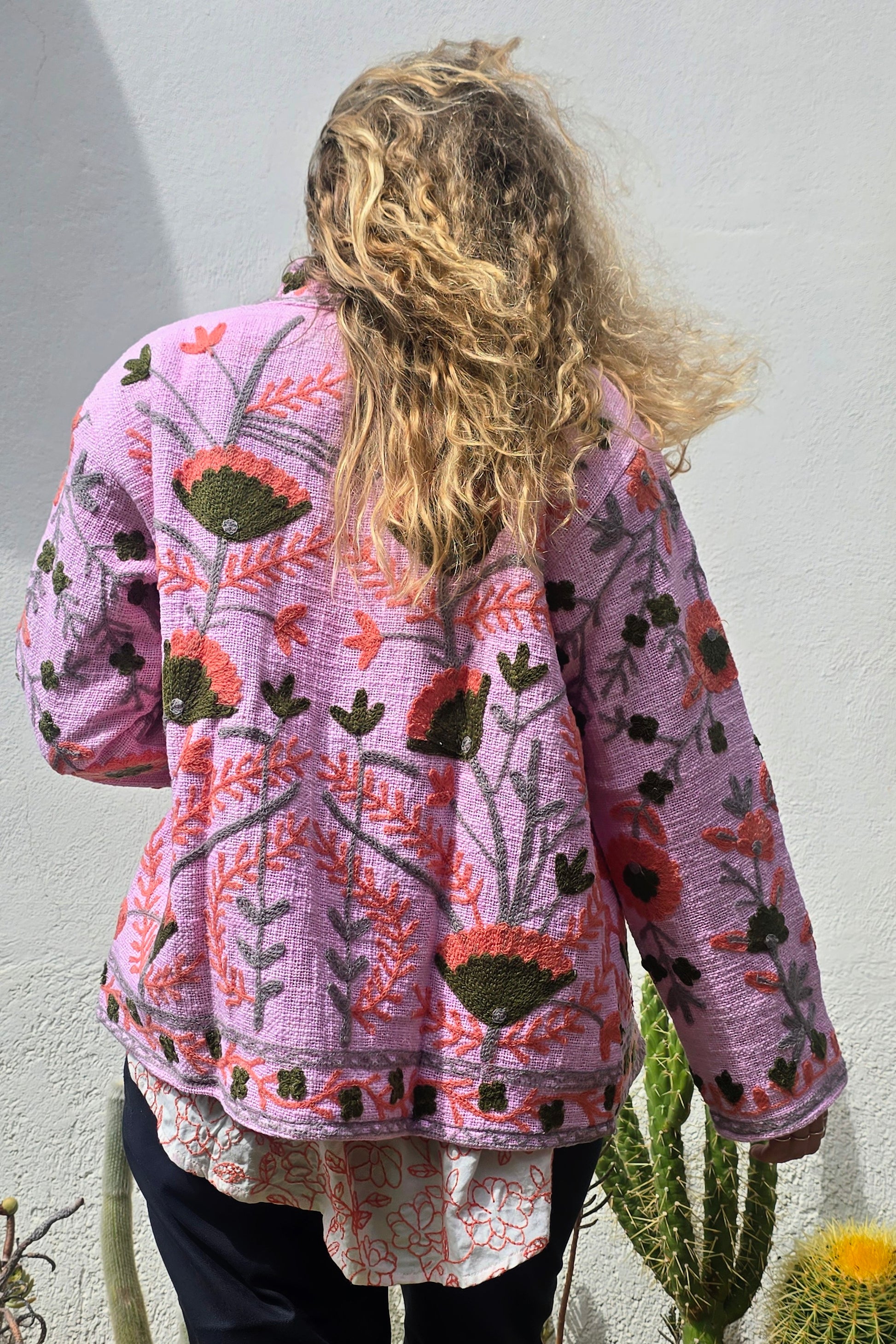 Questa giacca, è un esempio magnifico di un ricamo Suzani. Sono pezzi d'abbigliamento unici che catturano l'essenza dell'artigianato tradizionale dell'Asia Centrale, reinterpretate in chiave moderna.