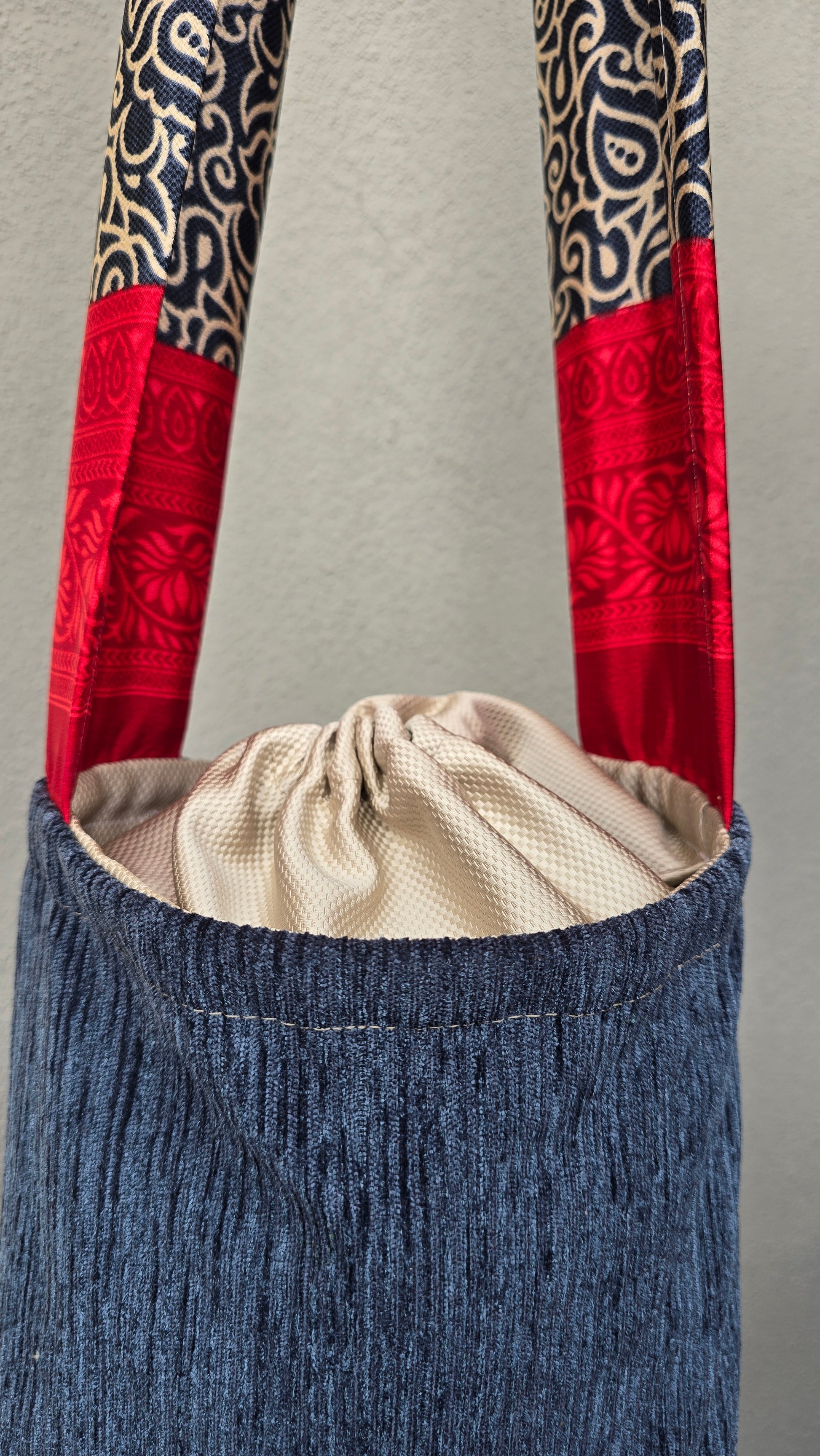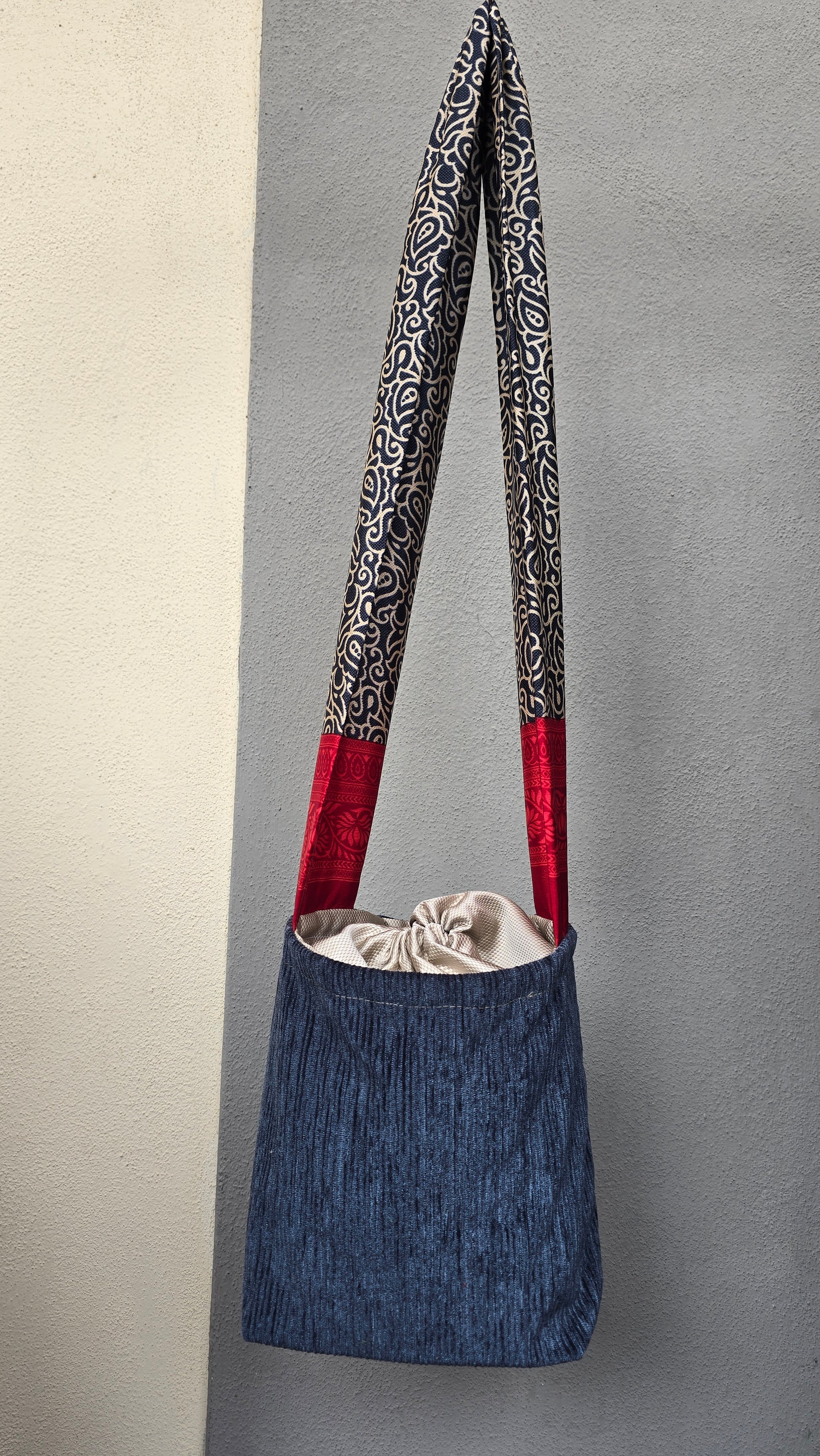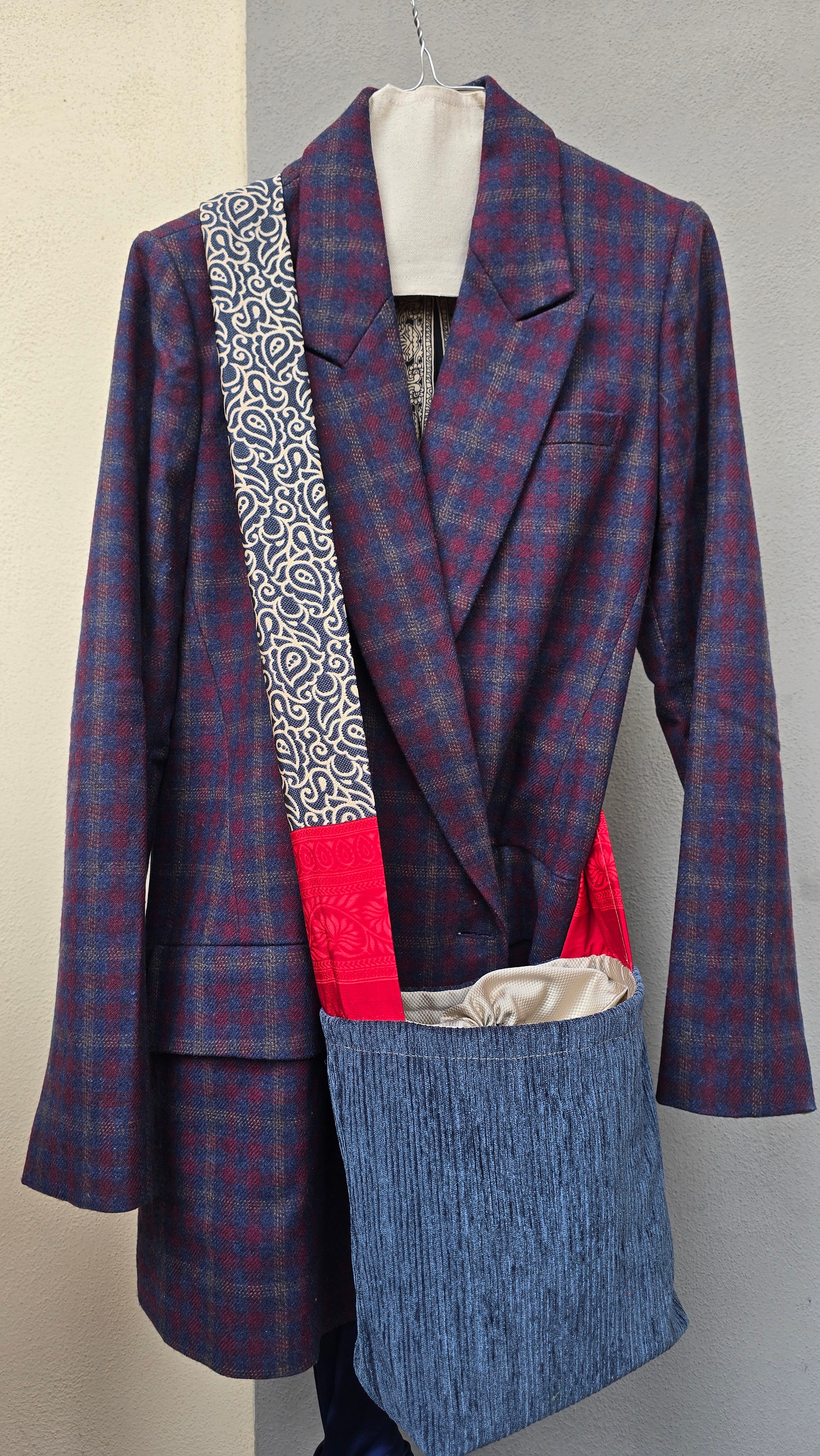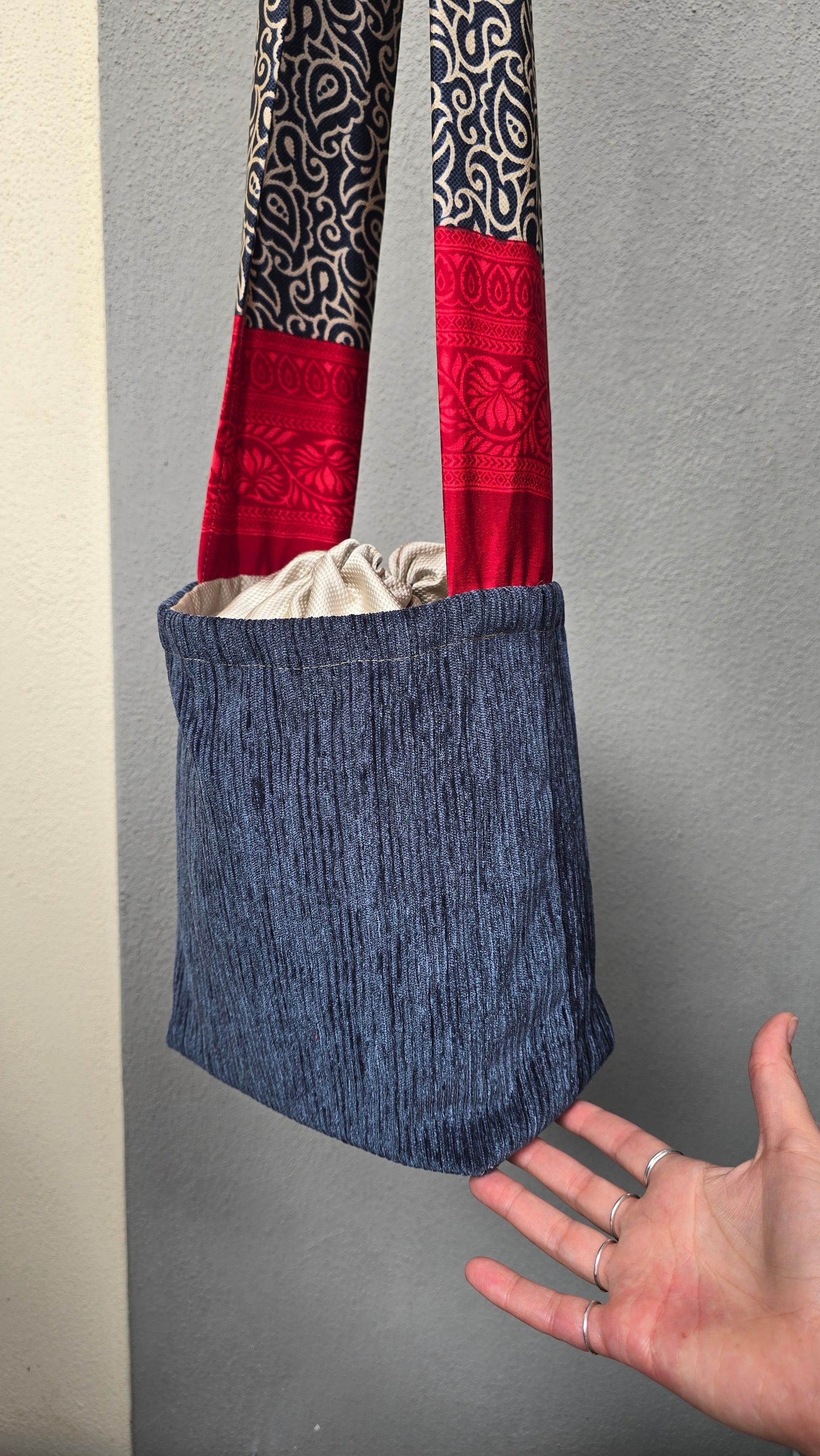 Ogni borsa è unica: ha una base semirigida, una fodera in cotone fantasia, una tasca interna e una coulisse che la chiude con naturalezza.