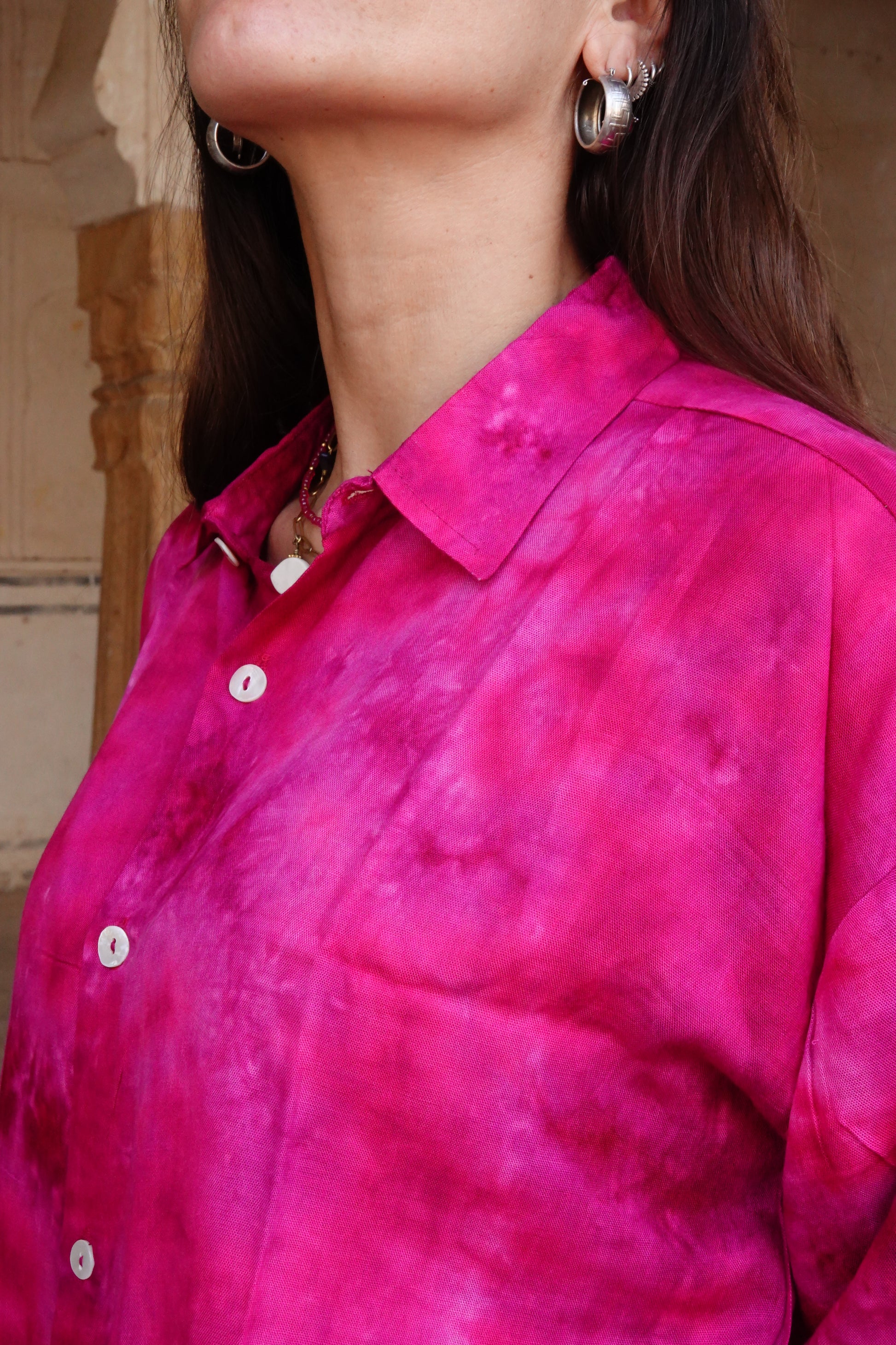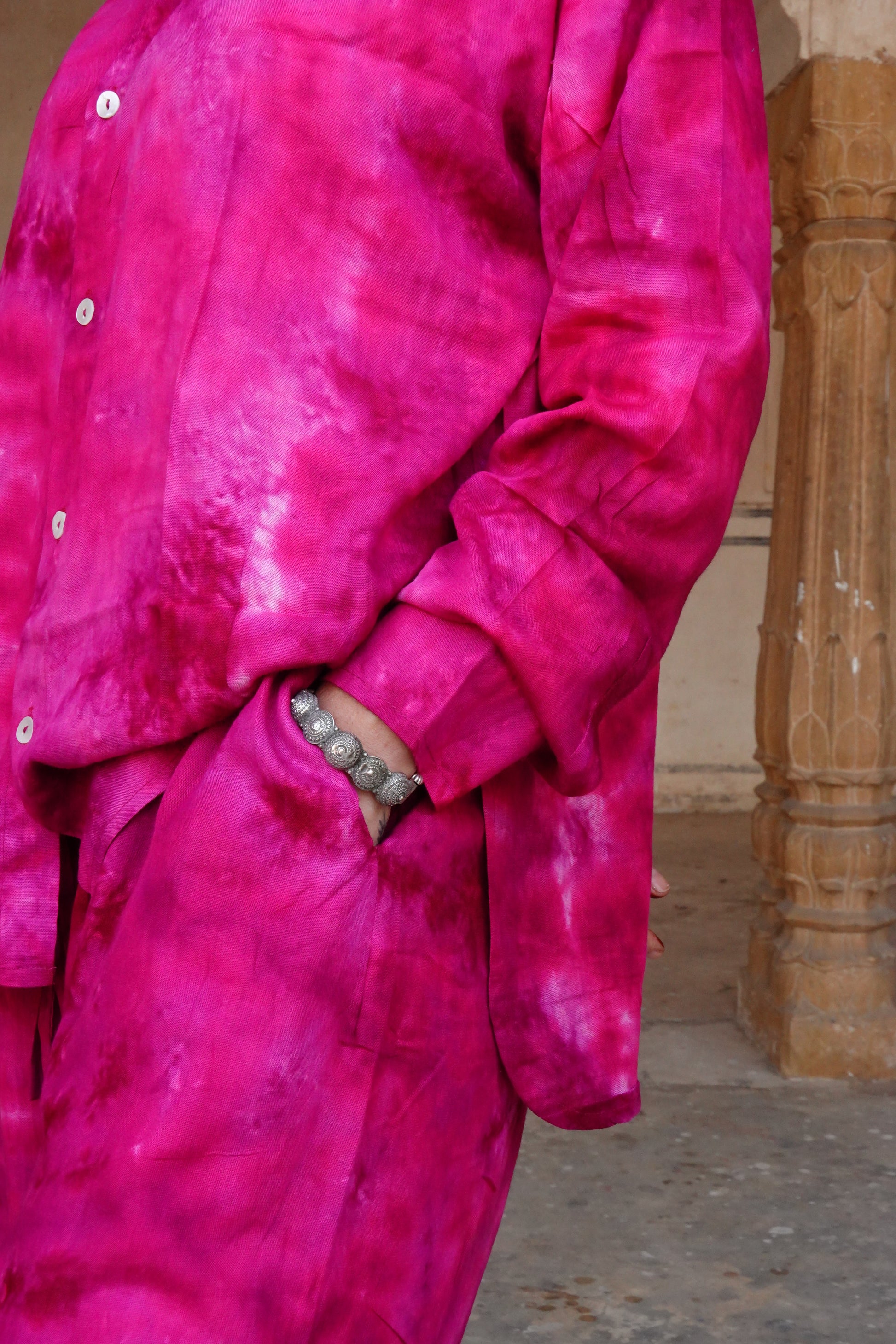 Il tie dye set composto da camicia a maniche lunghe con bottoni in madreperla, e pantaloni palazzo con tasche, elastico e coulisse in vita. I set sono unici e diversi tra loro per via del processo di tintura. Ogni pezzo è fatto a mano, il modo in cui il tessuto viene piegato legato e tinteggiato, determina il motivo finale. Questa caratteristica rende ogni completo un pezzo unico e distintivo. taglia unica (40-44).